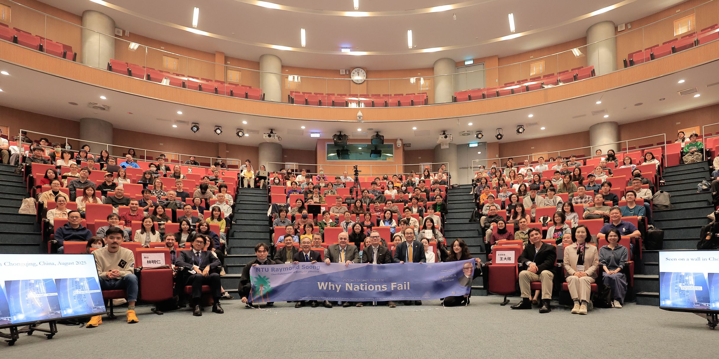 The National Taiwan University Raymond Soong Chair Professorship of Distinguished Research Lecture Series welcomed Professor James A. Robinson, 2024 Nobel Laureate in Economic Sciences and Professor at the Harris School of Public Policy, the University of Chicago, to deliver a keynote lecture on December 17, 2025. In conjunction with the keynote, SPE hosted three SPE-facing sessions: an interlocutor-style dialogue moderated by Dean Spyros Maniatis, and two class lectures titled “Searching for Fish in Trees” (I & II), moderated by Professor Mariam Malashkhia and Professor Hans Tung, respectively, highlighting Robinson’s research on how institutions and culture shape development outcomes.